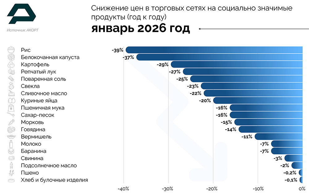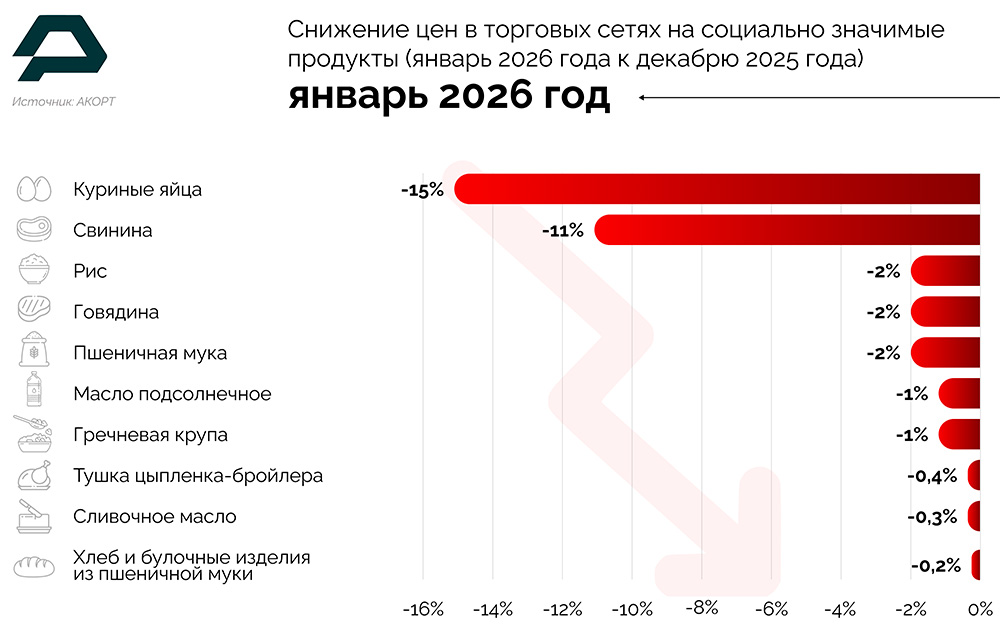 [1] в крупных торговых сетях в январе снизились на 10% в сравнении с январем 2025 года, показал мониторинг аналитического центра Ассоциации компаний омниканальной розничной торговли (АКОРТ).