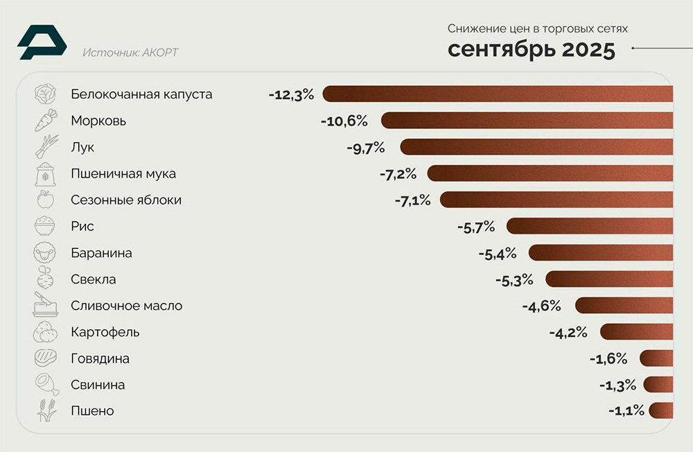 В сентябре снижение цен отмечено на продукты в 16 из 25 социально значимых категорий. Сильнее всего подешевели овощи борщевого набора: белокочанная капуста — на 12,3%, морковь — на 10,6%, репчатый лук — на 9,7%. Цены на свёклу снизились на 5,3%, на картофель — на 4,2%. Помимо овощей в крупных торговых сетях подешевели пшеничная мука (-7,2%), сезонные яблоки (-7,1%), рис (-5,7%), баранина (-5,4%), сливочное масло (-4,6%), говядина (-1,6%), чёрный чай (-1,5%), свинина (-1,3%), пшено (-1,1%). В пределах одного процента снизились цены на поваренную соль.