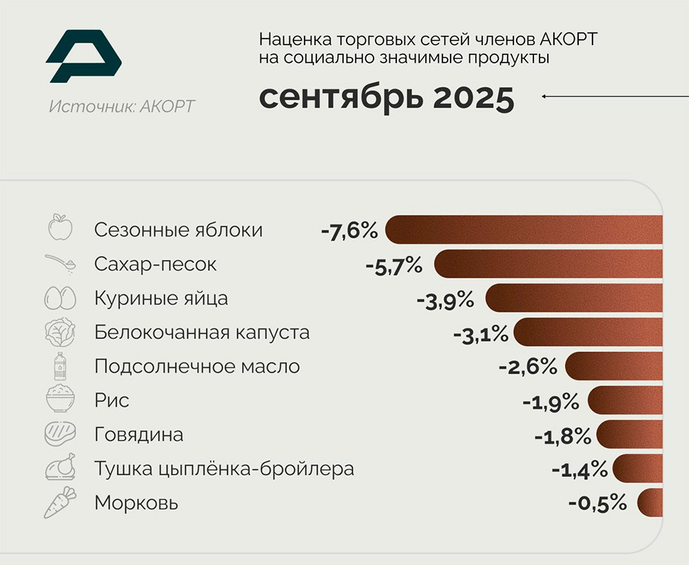В сентябре снижение цен отмечено на продукты в 16 из 25 социально значимых категорий. Сильнее всего подешевели овощи борщевого набора: белокочанная капуста — на 12,3%, морковь — на 10,6%, репчатый лук — на 9,7%. Цены на свёклу снизились на 5,3%, на картофель — на 4,2%. Помимо овощей в крупных торговых сетях подешевели пшеничная мука (-7,2%), сезонные яблоки (-7,1%), рис (-5,7%), баранина (-5,4%), сливочное масло (-4,6%), говядина (-1,6%), чёрный чай (-1,5%), свинина (-1,3%), пшено (-1,1%). В пределах одного процента снизились цены на поваренную соль.